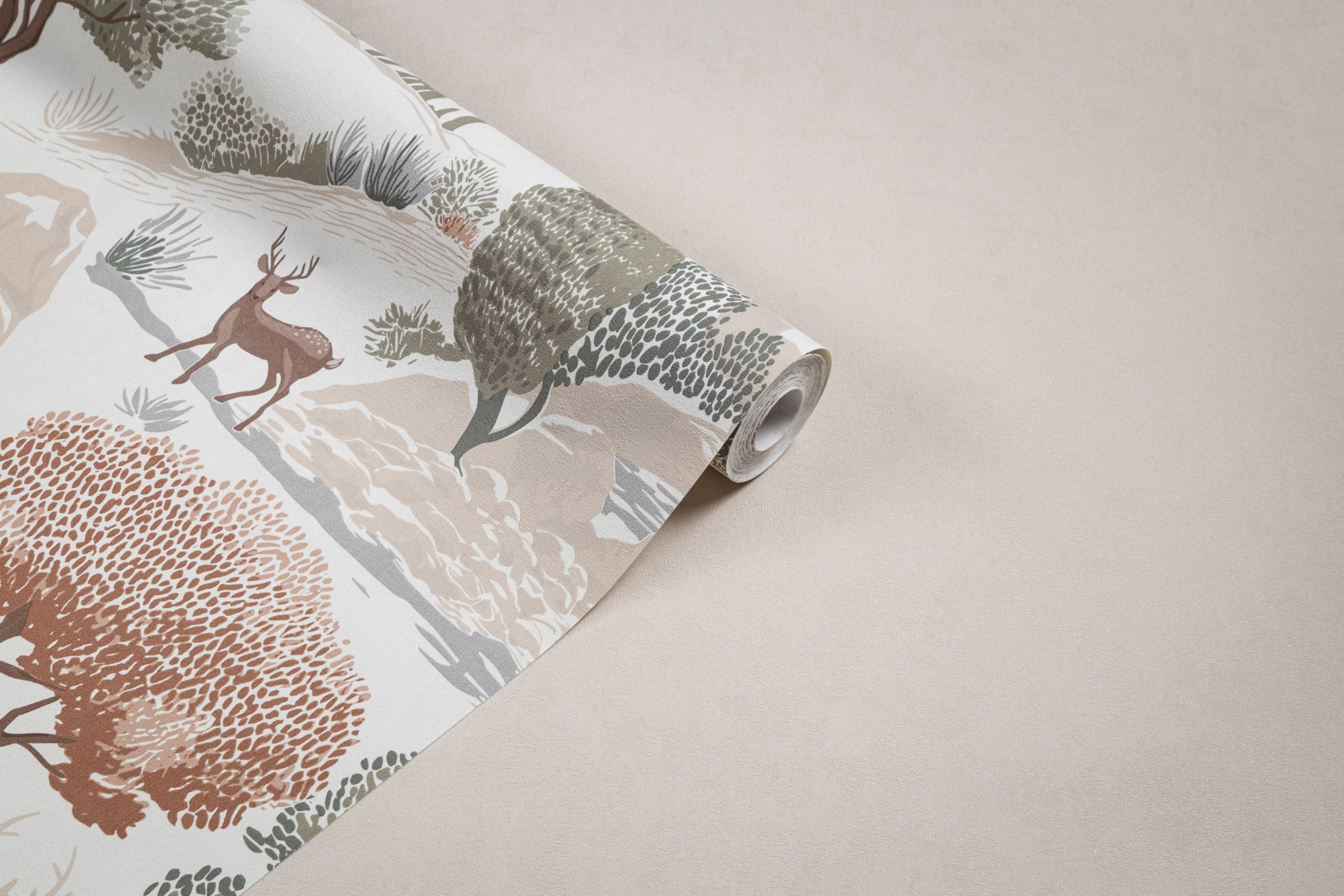 Живописный сюжет с деревьями и оленями в nordic-стиле.