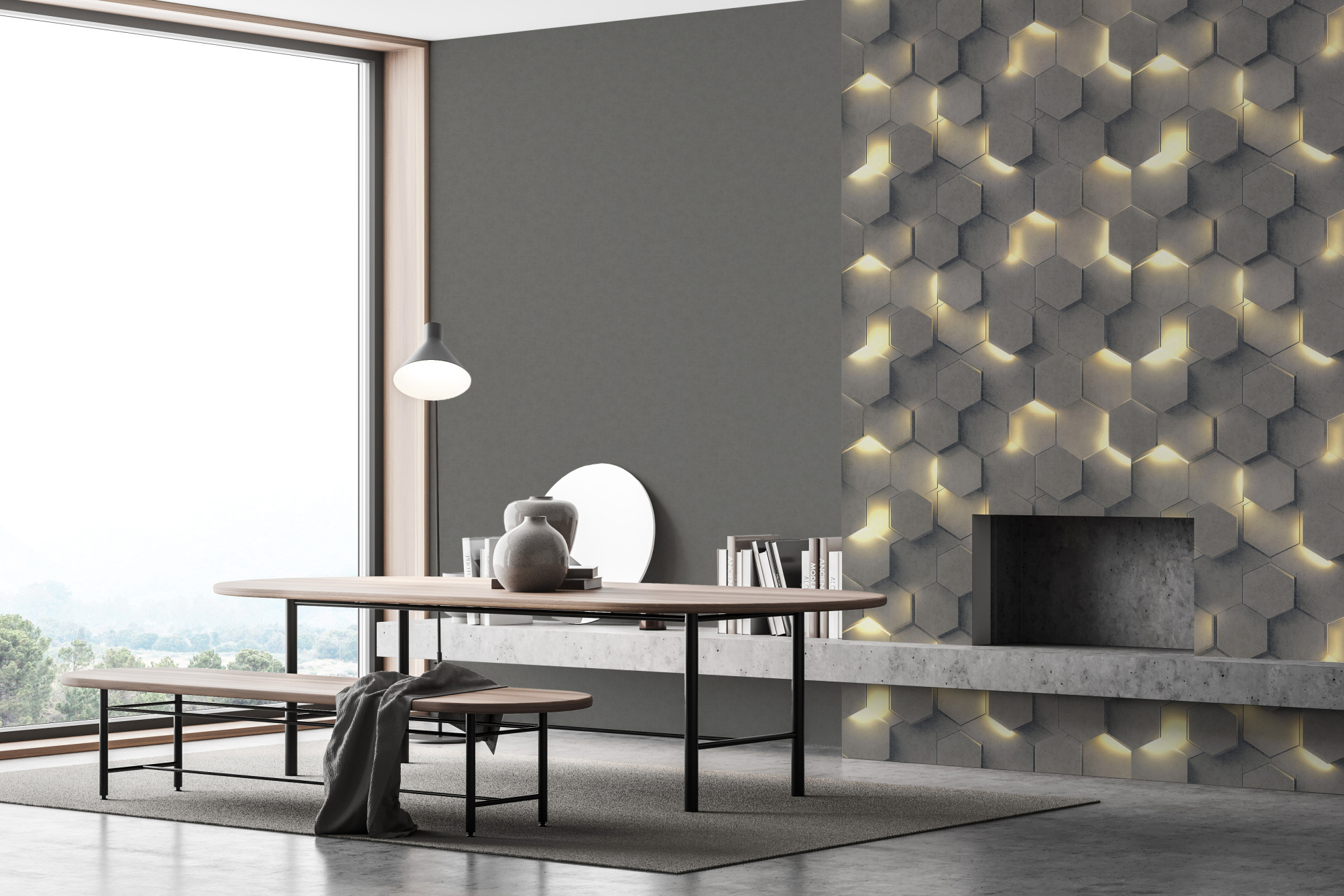 Матовая фактура штукатурки служит фоном для чёткого, но не навязчивого орнамента. Идеальные соты то проступают сквозь реалистичную текстуру, то мягко растворяются в ней. Иллюзия выразительного 3D-эффекта достигается за счёт сложных колористических решений и имитации подсветки – как будто яркий свет прорывается сквозь графичные детали рисунка.