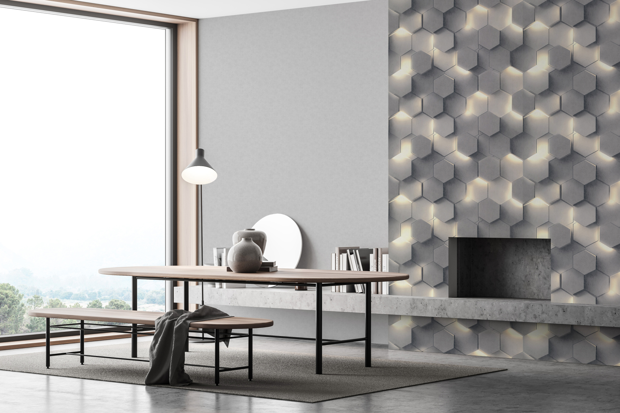 Матовая фактура штукатурки служит фоном для чёткого, но не навязчивого орнамента. Идеальные соты то проступают сквозь реалистичную текстуру, то мягко растворяются в ней. Иллюзия выразительного 3D-эффекта достигается за счёт сложных колористических решений и имитации подсветки – как будто яркий свет прорывается сквозь графичные детали рисунка.