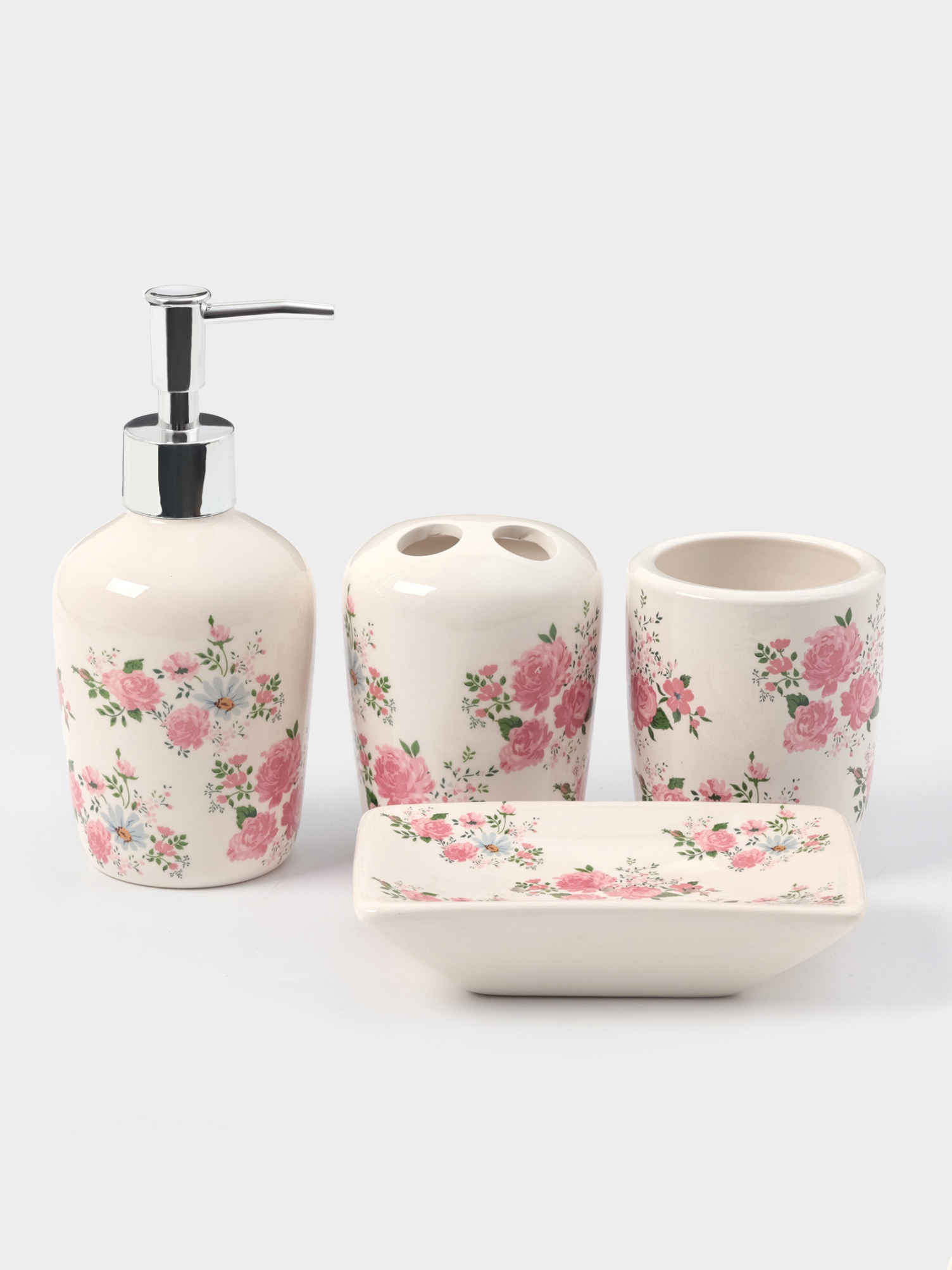 Набор «Розовые розы», 4 предмета: мыльница, дозатор для мыла, 2 стакана (белый)
