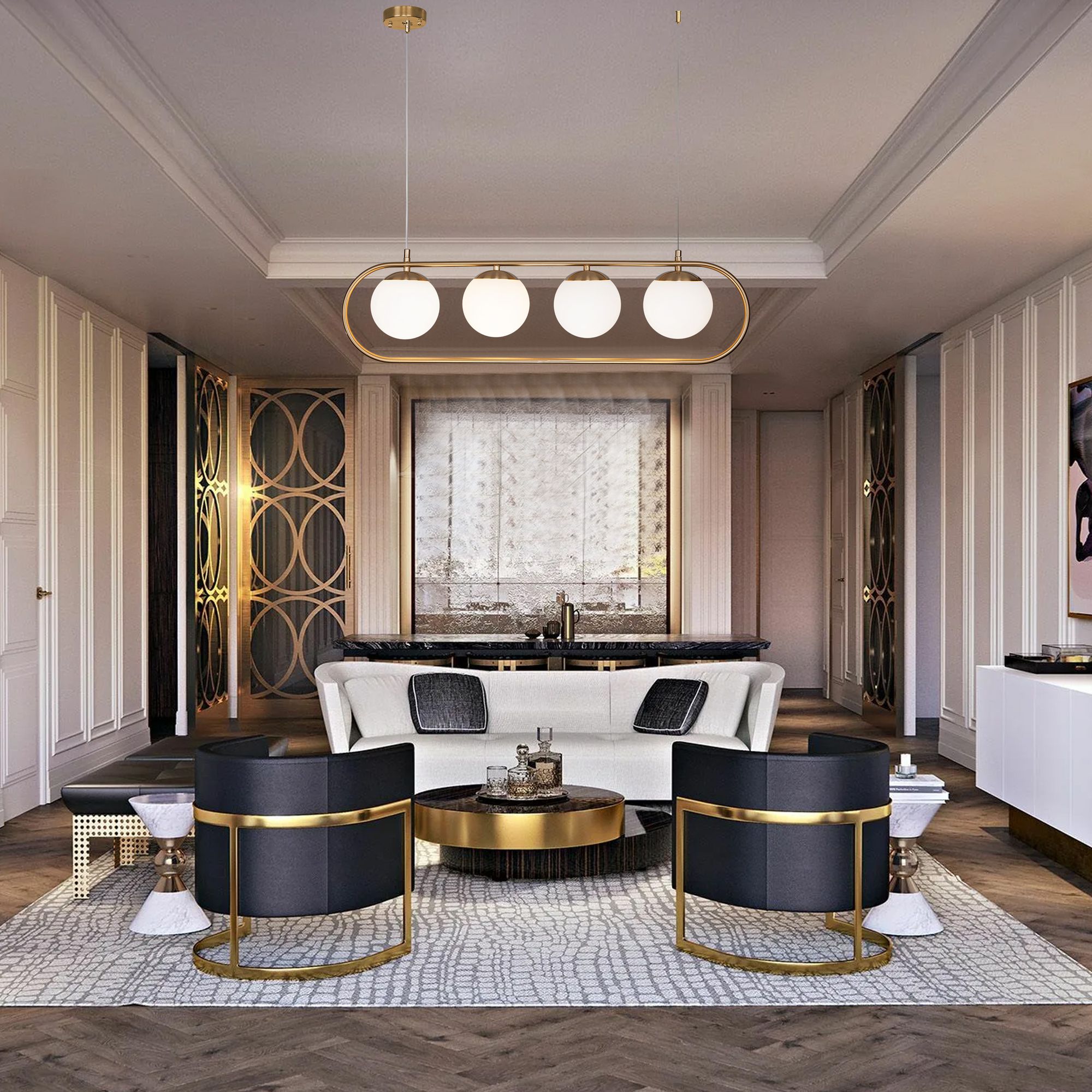 Подвесной светильник со стеклянными плафонами 50089/4 в цвете золото предназначен для создания дополнительного освещения и акцентной подсветки в современных интерьерах. Светильник со сменными лампами E27 создаст качественное освещение на площади 16 кв.м. и подсветит рабочие зоны на кухне, в гостиной и других местах.