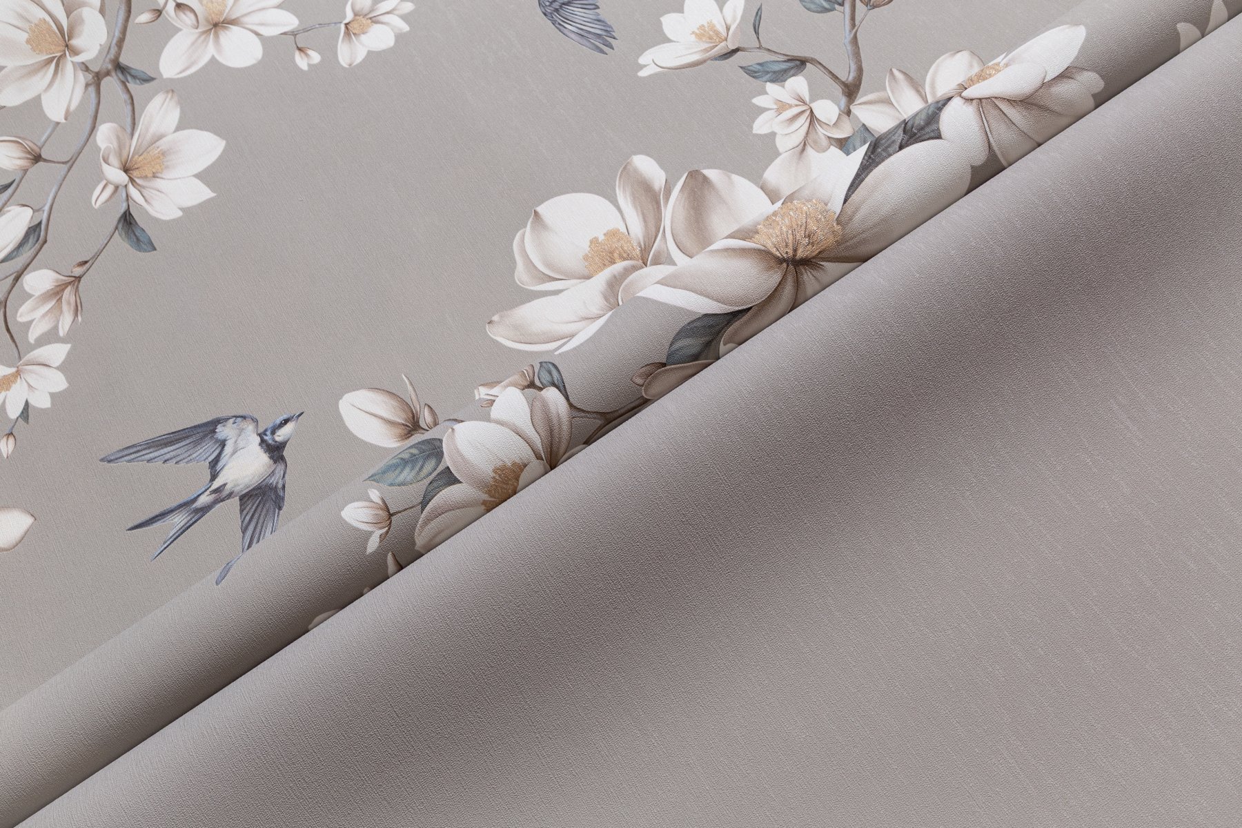 Авантажную тему обоев Magnolia составляют изящные соцветия магнолии и веселое щебетание порхающих в воздухе птиц – весенний мотив, который наполнен светлой радостью от пробуждения природы.