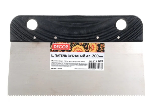 Шпатель DЕCOR зубчатый А2 200 мм 80 мм 0,5 мм, для нанесения клея под напольные покрытия