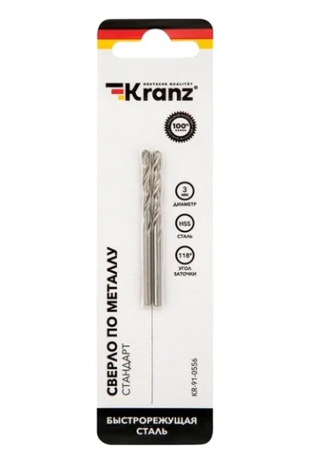 Сверло по металлу 3,0х61х33 мм HSS (2 шт. в упаковке) DIN 338 Kranz