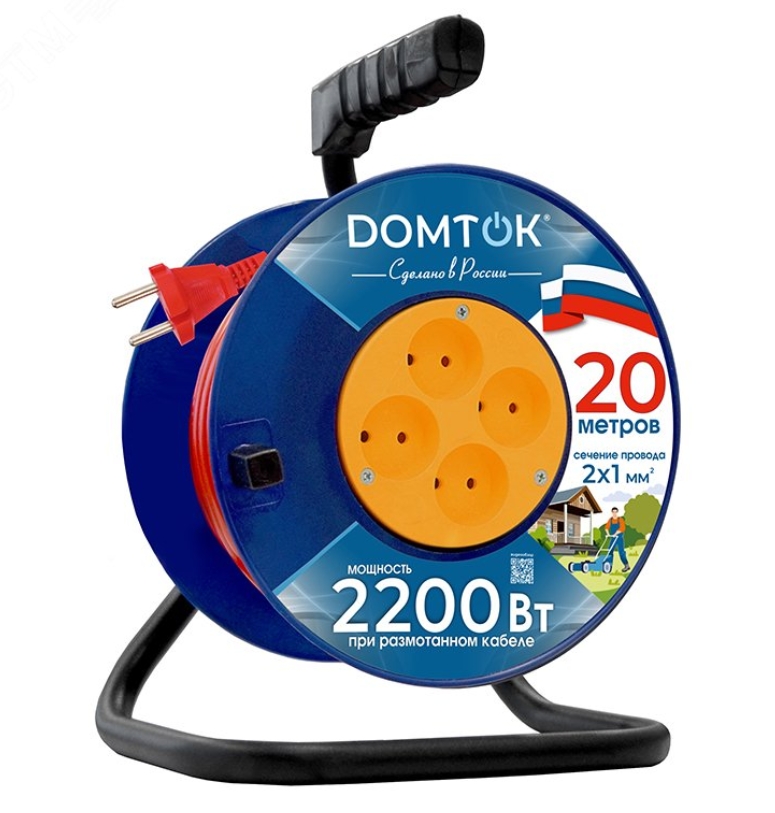 Удлинитель силовой на катушке "DOMTOK" 4гн., ПВС 2*1, 2,2кВт, б/з 20м