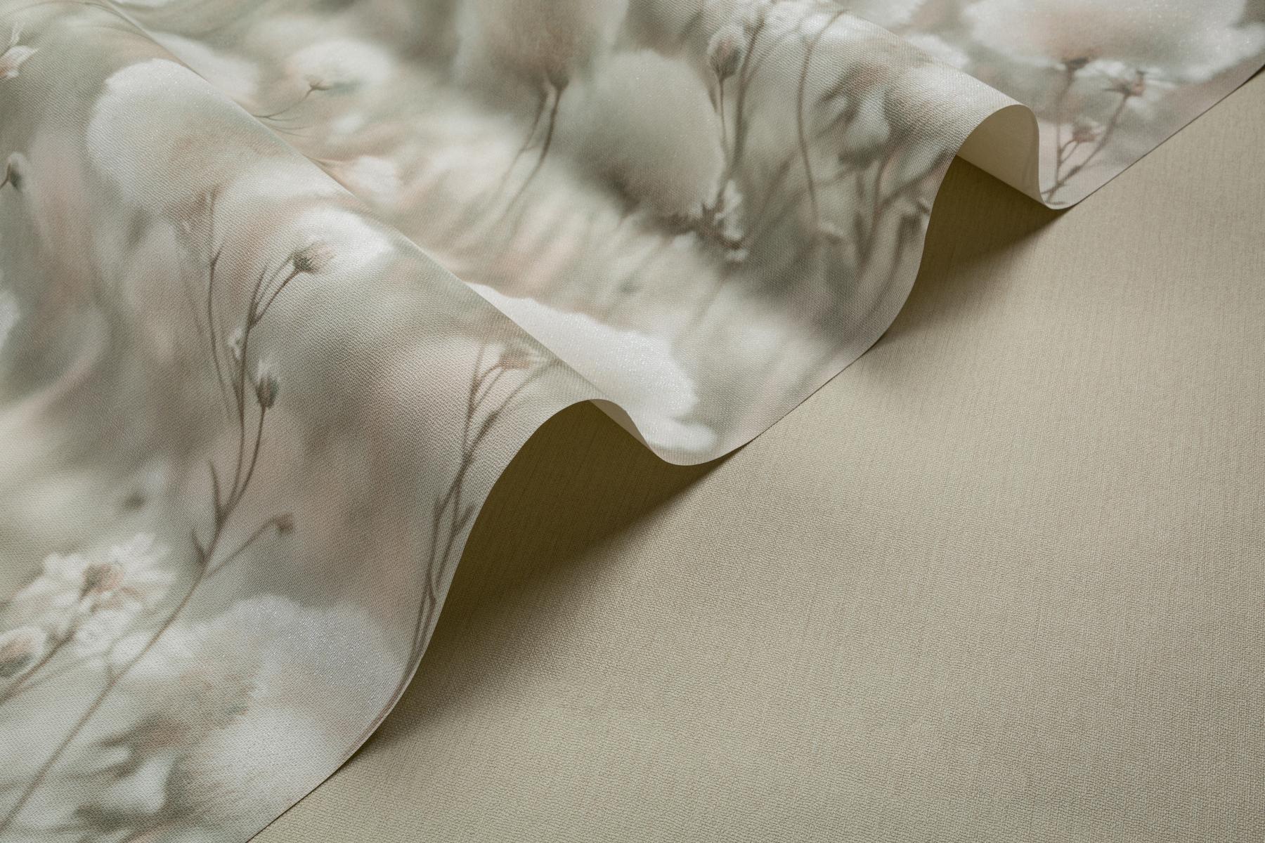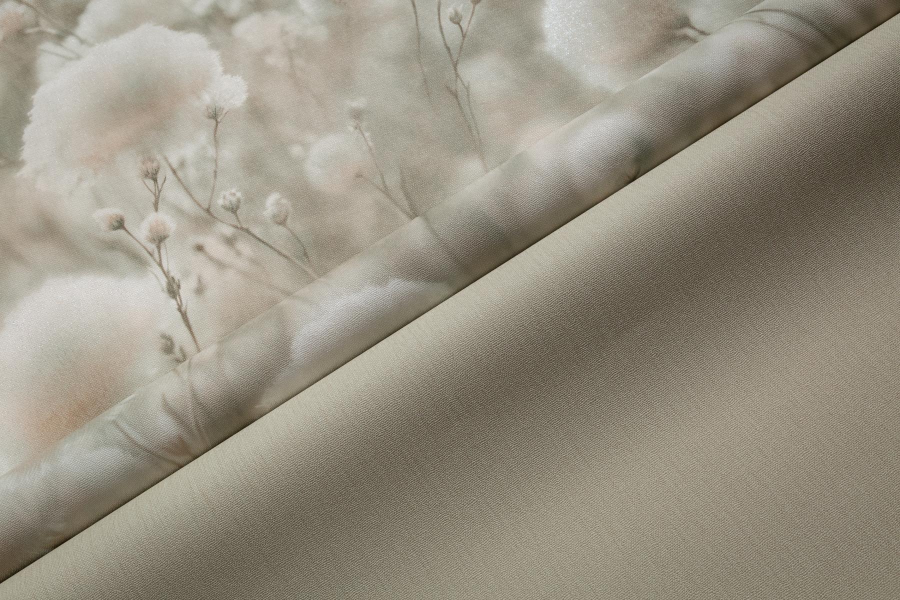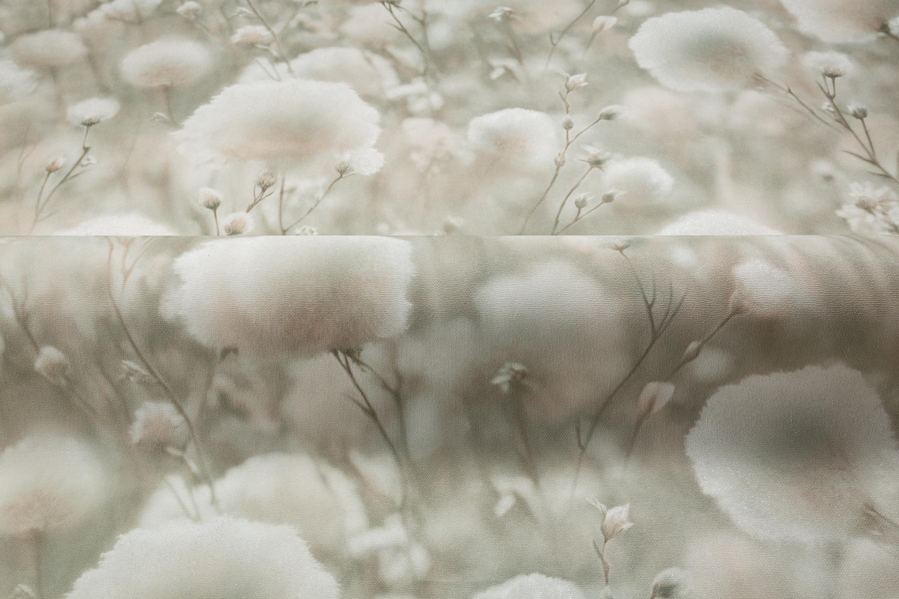 Воздушные соцветия хлопка, окутанные туманной дымкой, наполняют интерьер домашним уютом. Теплый пушистый мотив дышит нежностью летнего утра. Многоплановый рисунок Cottonia отрисован с фотографической точностью и создает эффект единого панно.