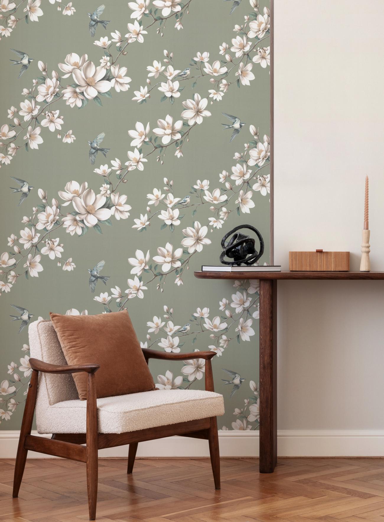 Авантажную тему обоев Magnolia составляют изящные соцветия магнолии и веселое щебетание порхающих в воздухе птиц – весенний мотив, который наполнен светлой радостью от пробуждения природы.